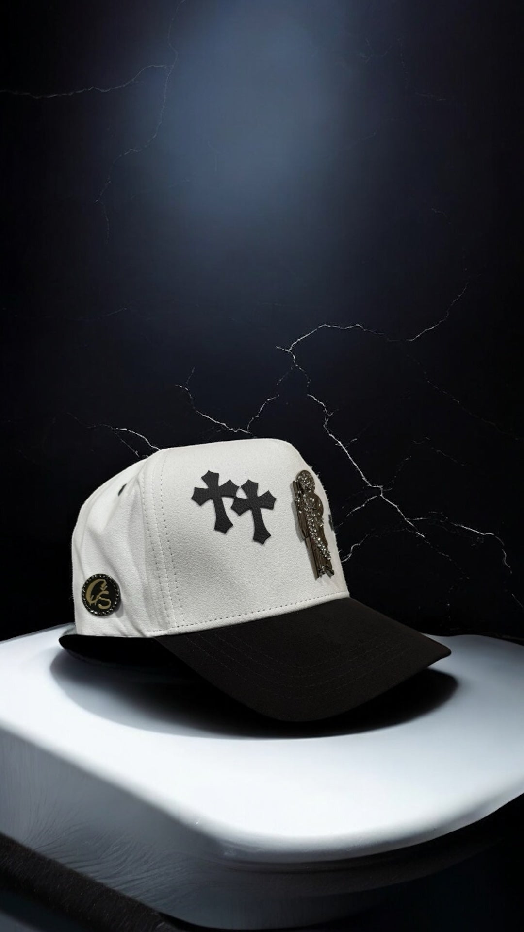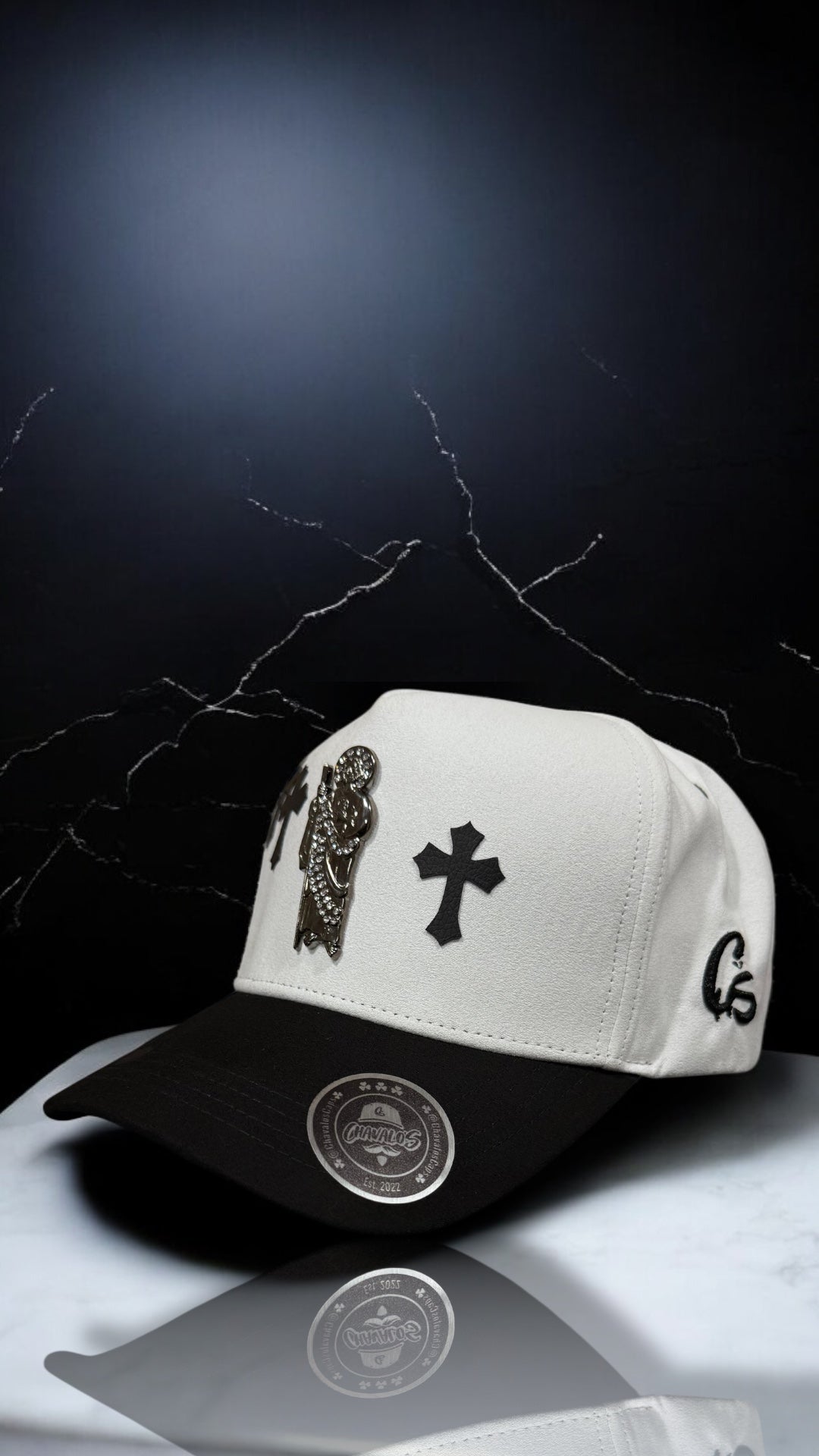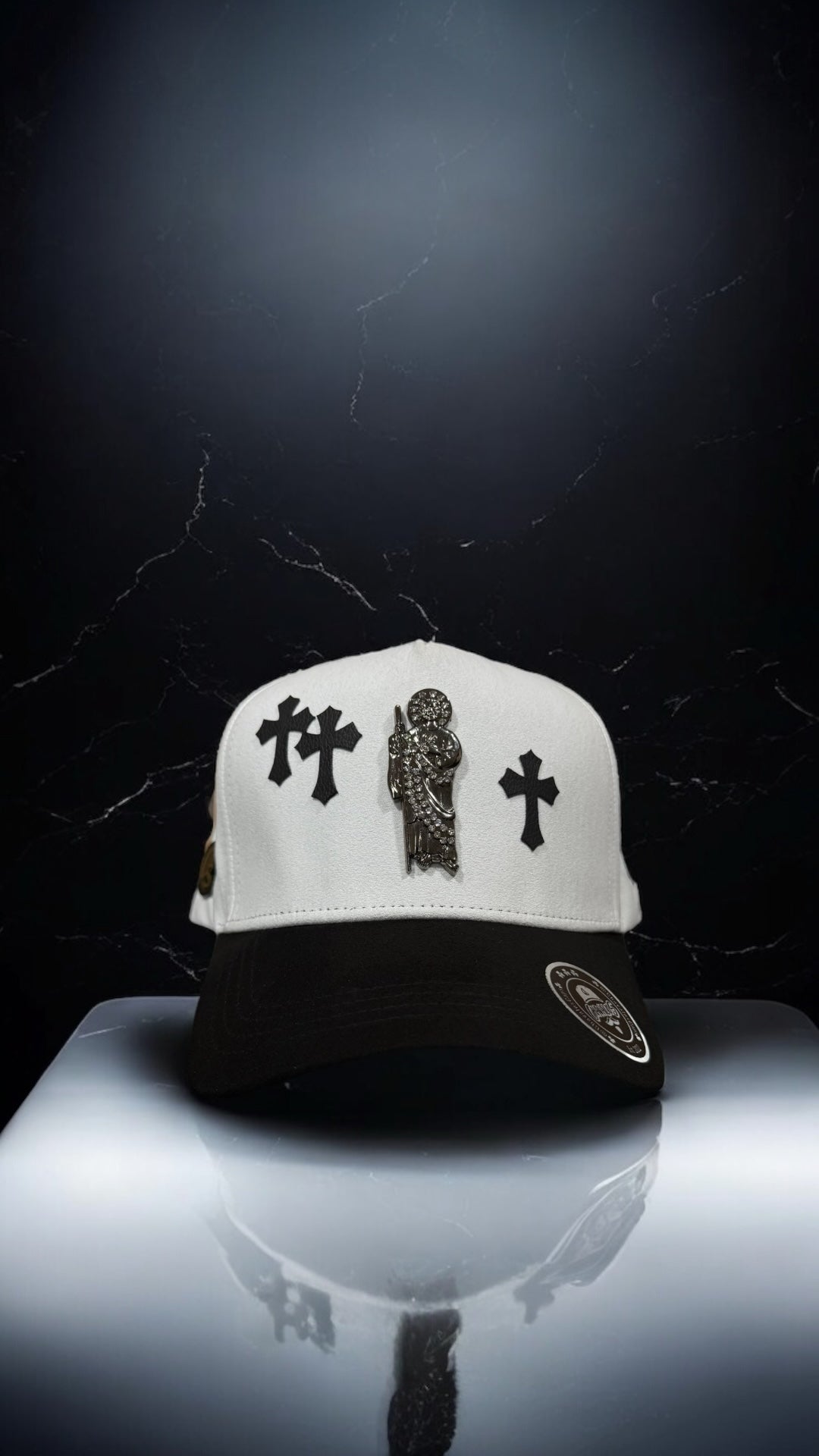 Elevate your fashion statement with our San Judas, Cruzes cap. Featuring a metallic San Judas charm with intricate stone detailing, and leather sides with crosses , this black and white cap is the perfect combination of style and faith.